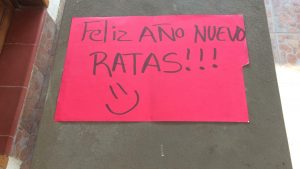 Fue cuando se les ocurrió pegarle una cartulina con la leyenda “Feliz año nuevo ratas” y la dejaron al frente de la casa para que la gente se diera cuenta de lo que había sucedido por falta de vigilancia efectiva.