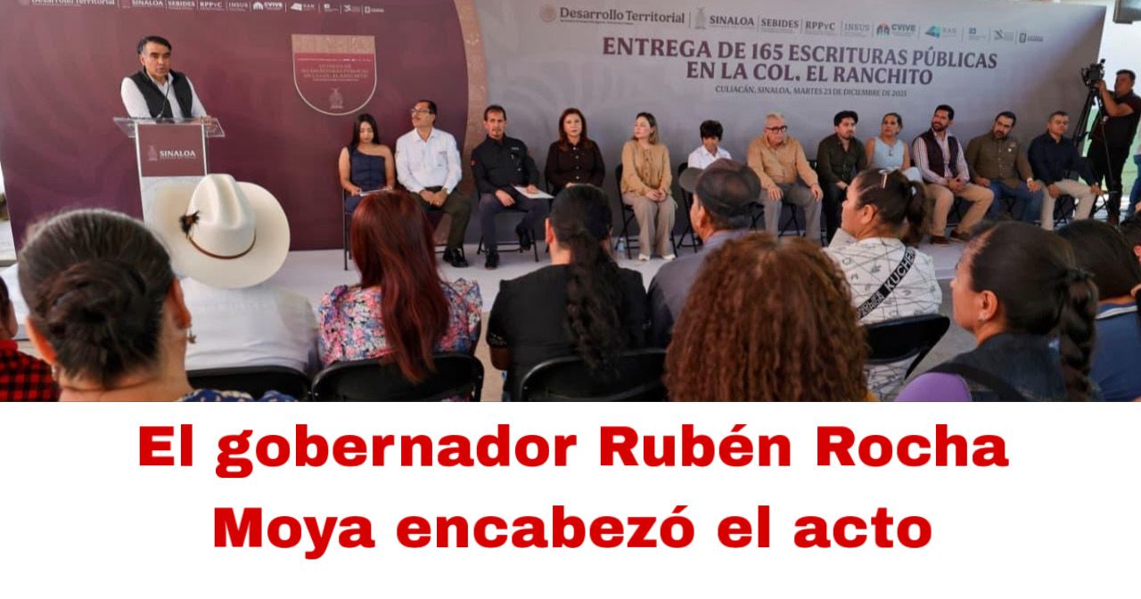Culiacán, Sin. 23 dic. 2025.- En un acto de justicia social, el gobernador Rubén Rocha Moya, acompañado por la secretaria de Desarrollo Agrario, Territorial y Urbano, Edna Elena Vega Rangel; y por el director del Instituto Nacional del Suelo Sustentable (INSUS), Víctor Rubén Guzmán Dagnino, entregó 164 títulos de propiedad a igual número de familias de El Ranchito, al sur de Culiacán, con lo que les otorgó la certeza jurídica de que sus viviendas ya son consideradas su legítimo patrimonio.