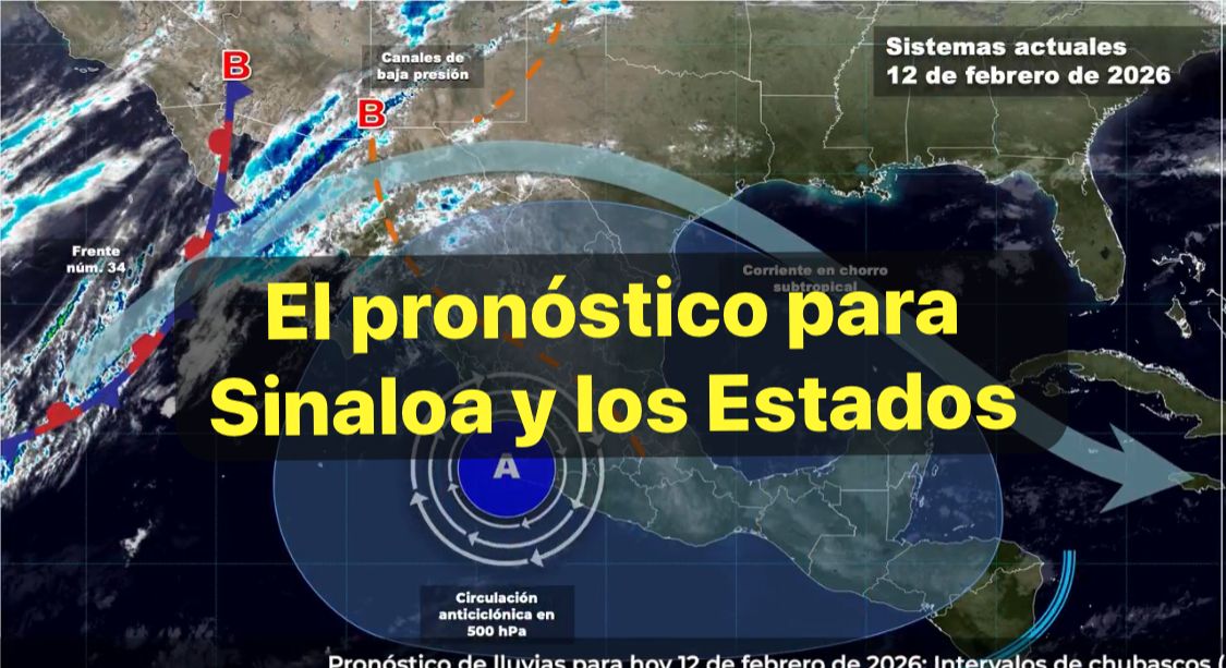 México, 12 feb. 2026.Este día, el frente número 34 y una vaguada polar se desplazarán lentamente sobre el noroeste del territorio nacional, en interacción con las corrientes en chorro polar y subtropical, originarán descenso de temperatura, rachas de viento, lluvias y chubascos en dicha región, así como posible caída de nieve o aguanieve en la sierra de San Pedro Mártir, BC.