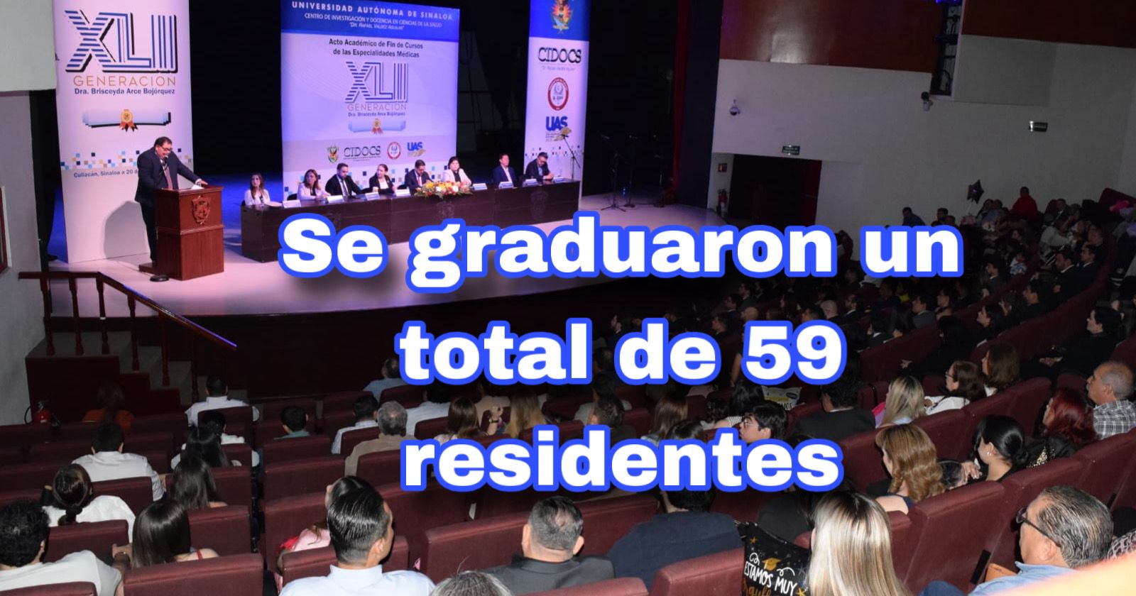 Culiacán,Sin.,21 feb. 2026.-Con el orgullo de haberse formado en la Universidad Autónoma de Sinaloa y egresar de una de las mejores especialidades de México, se llevó a cabo en el Teatro de la Torre Académica el acto académico de fin de cursos de las Especialidades Médicas de la XLII Generación, la cual llevó el nombre de la doctora Briseyda Arce Bojórquez. En la ceremonia, recibieron su constancia 57 médicos formados en el Centro de Investigación y Docencia en Ciencias de la Salud (CIDOCS).