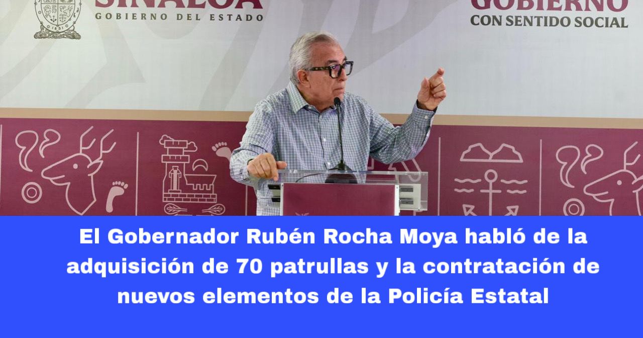 Culiacán, Sin., 19 agosto 2025.- La adquisición de 70 patrullas a través de dos procesos de licitación y la contratación de 211 nuevos elementos de la Policía Estatal fortalecerán tanto a la corporación como a la seguridad de los municipios, destacó este martes el Gobernador Rubén Rocha Moya, durante su Conferencia Semanera.