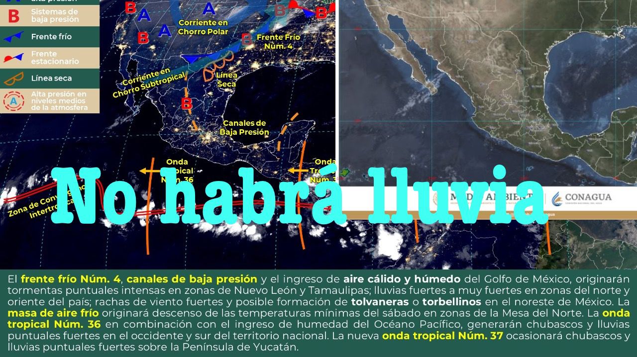 Por otra parte, la onda tropical Núm. 36 se desplazará al suroeste de las costas de Jalisco y Colima, en combinación con el ingreso de humedad del Océano Pacífico generarán chubascos y lluvias puntuales fuertes en el occidente y sur del territorio nacional.