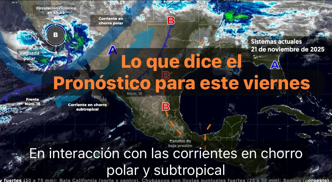 México,21 nov. 2025.-Para hoy, el nuevo frente frío (número 16) que se aproximará al noroeste del país, asociado con una circulación ciclónica en altura y con una vaguada polar, en interacción con las corrientes en chorro polar y subtropical, dará origen a la primera tormenta invernal de la temporada, por lo que se pronostican lluvias puntuales muy fuertes en Baja California (norte y centro); puntuales fuertes en Sonora, y lluvias con intervalos de chubascos en Baja California Sur, acompañadas de viento con rachas de 40 a 60 km/h en la región, así como descenso de las temperaturas y condiciones para la posible caída de nieve y/o aguanieve en sierras del norte de Baja California y del noroeste de Sonora.