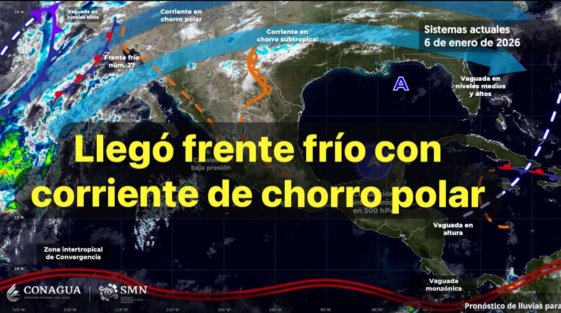 México, 6 ene 2026.-Hoy, el frente número 27 sobre el noroeste del país, será reforzado, en combinación con las corrientes en chorro polar y subtropical y con una vaguada en niveles altos de la atmósfera, generarán descenso de temperatura y rachas de viento de 30 a 50 km/h, así como lluvias y chubascos en la península de Baja California.