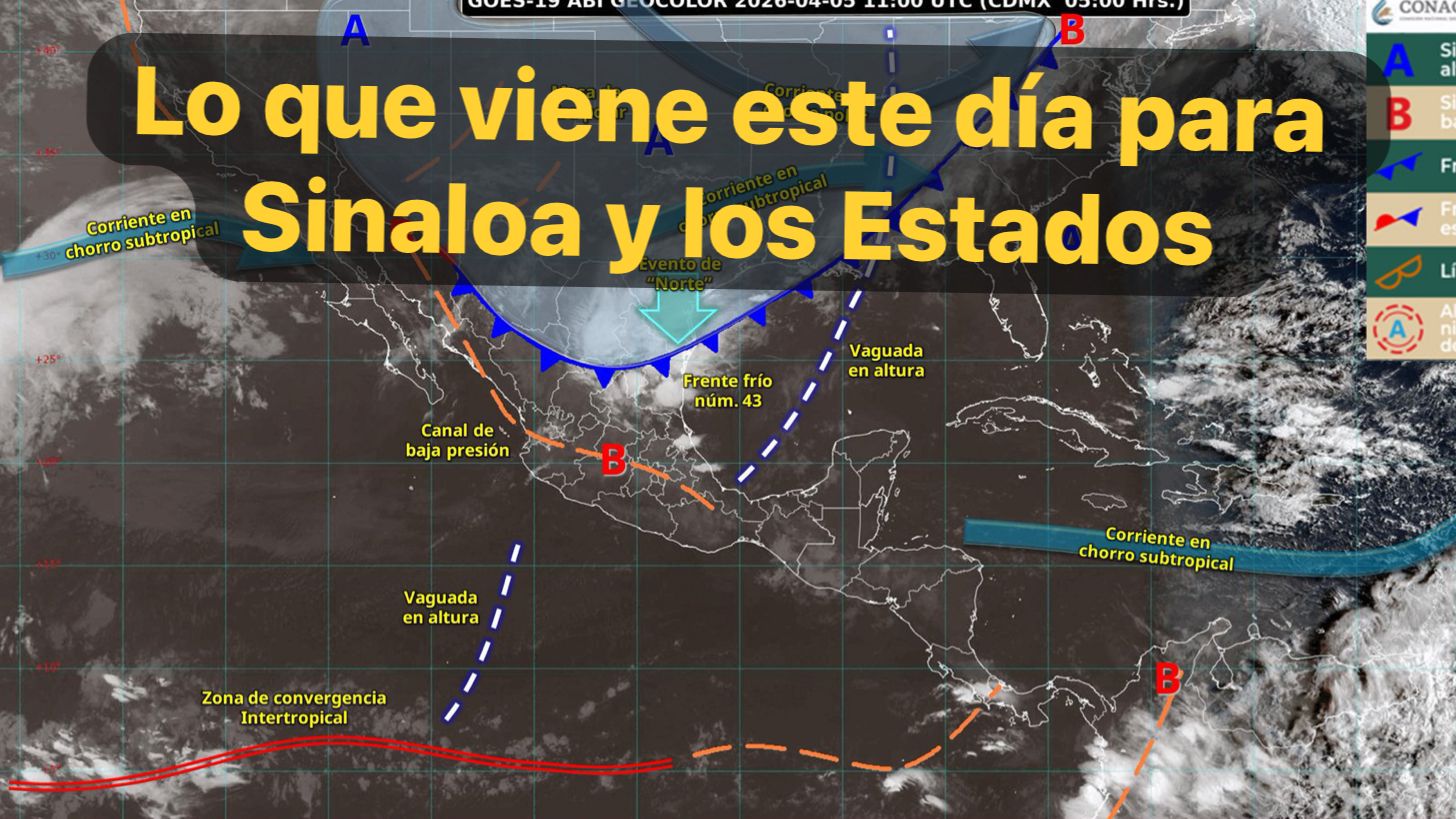 México,5 abril 2026.-Este día, el frente frío número 43 se desplazará sobre el litoral del golfo de México, interaccionando con una vaguada en altura y con un canal de baja presión, originando lluvias fuertes a muy fuertes, descargas eléctricas y posible caída de granizo en el norte, noreste, centro y oriente del país, así como lluvias puntuales intensas en regiones de Hidalgo, Puebla y Veracruz.