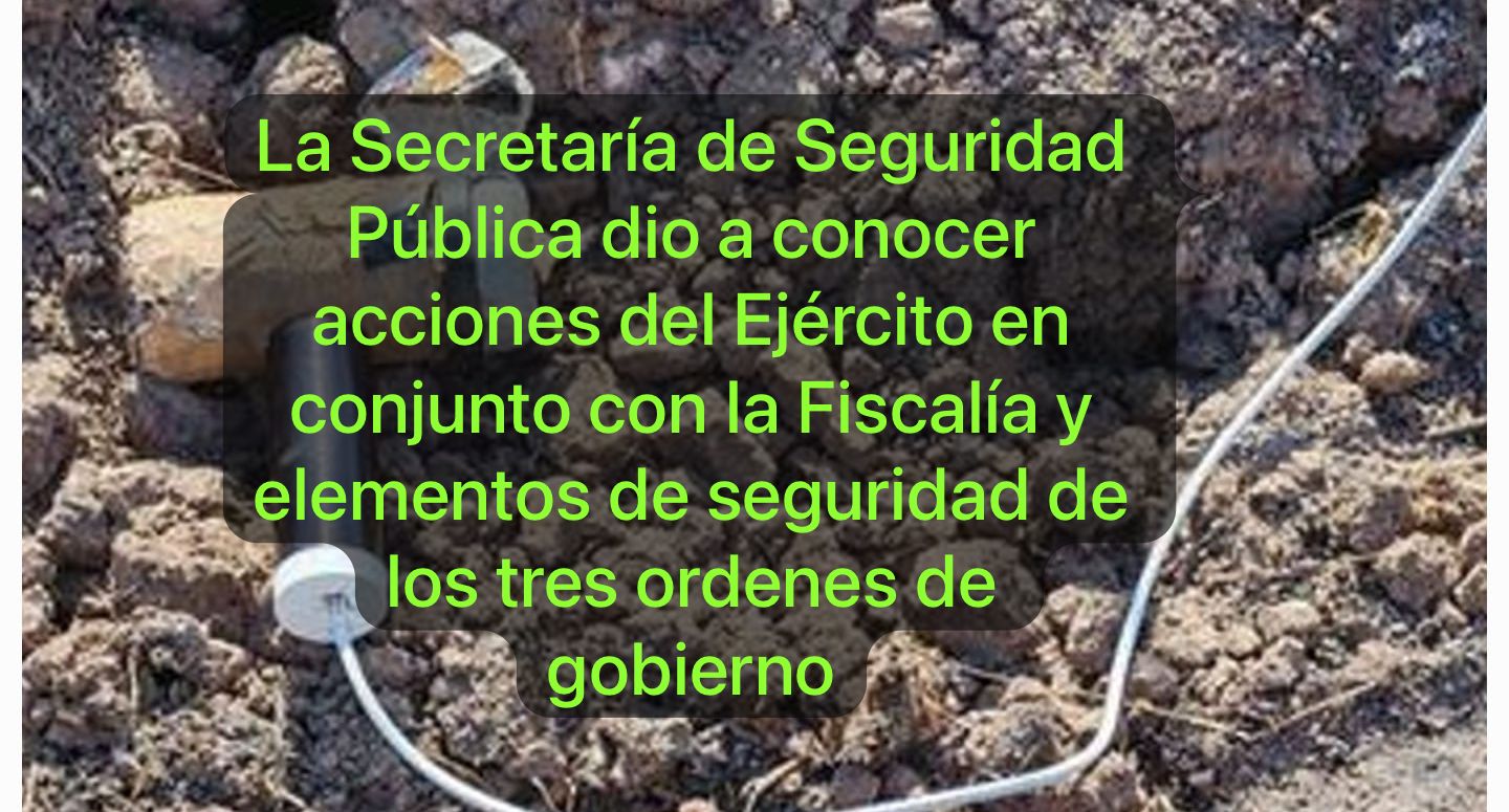 En otra acción en la sindicatura, elementos militares integrantes de la Célula Contra Artefactos Explosivos llevaron a cabo la destrucción de un artefacto explosivo improvisado con las siguientes características: tubo galvanizado (empleado como granada de mano), de 16 cm de longitud y 7.5 cm de diámetro, con mecha lenta y carga de emulgel.