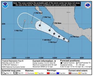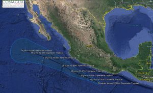La Comisión Nacional el Agua informo de la formación de la depresión tropical cuatro E en el Océano pacifico.