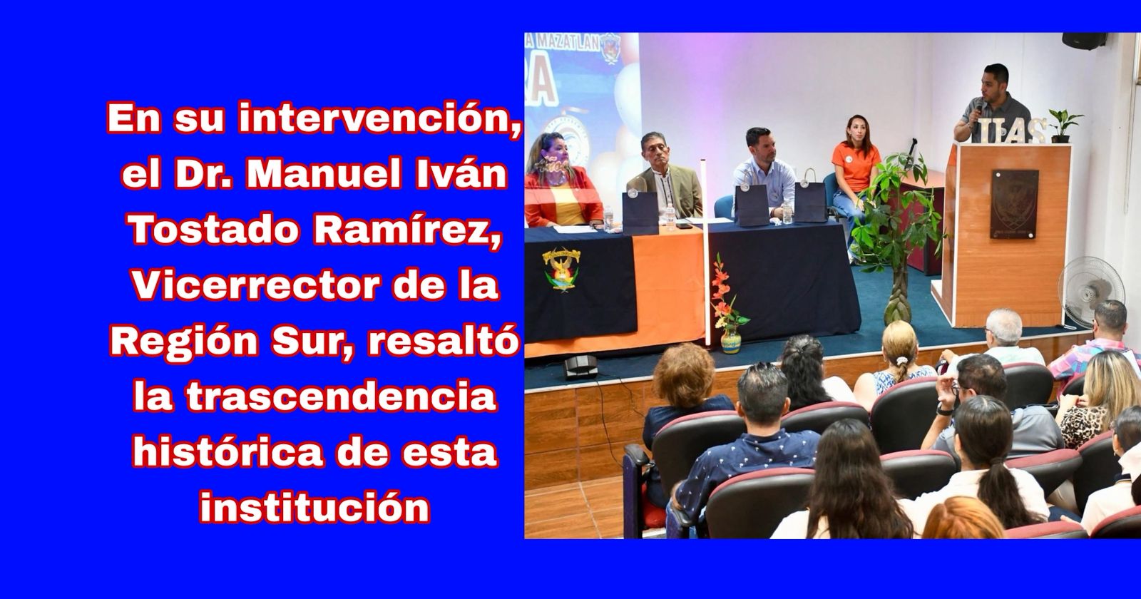 En su intervención, el Dr. Manuel Iván Tostado Ramírez, Vicerrector de la Región Sur, resaltó la trascendencia histórica de la Prepa Mazatlán en el desarrollo social y educativo de Sinaloa.