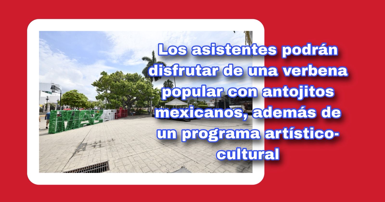 Como parte del programa, los asistentes podrán disfrutar de una verbena popular con antojitos mexicanos, además de un programa artístico-cultural encabezado por el Ballet Folclórico del Instituto Municipal de Cultura, la cantante mazatleca Heidi Herrera y, para cerrar con “broche de oro”, el espectáculo musical de Mi Banda El Mexicano.