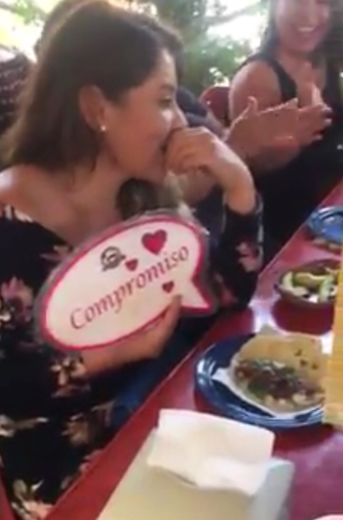 En el material difundido en video se observa cómo una mesera le trae el taco a la joven, sin haberlo ordenado, y ante su reacción, pues ella muere de la pena, la mesera le explica que era parte de una sorpresa bajo la tortilla: un anillo de compromiso.