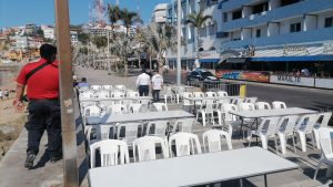 En la avenida Olas Altas, ya son colocadas cientos de mesas y sillas para las familias que acudirán al festejo.