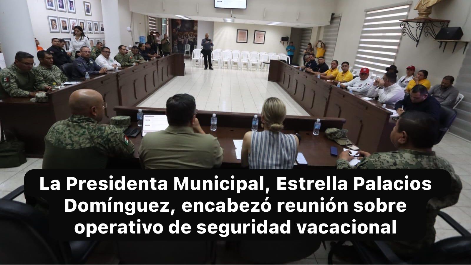 Mazatlán, Sin., 23 marzo 2026.– La Presidenta Municipal, Estrella Palacios Domínguez, encabezó la tarde de este lunes una reunión con autoridades de seguridad y cuerpos de auxilio de los tres niveles de gobierno, en la Sala de Cabildo del Ayuntamiento, con el objetivo de afinar los detalles del Operativo de Seguridad de Semana Santa 2026.
