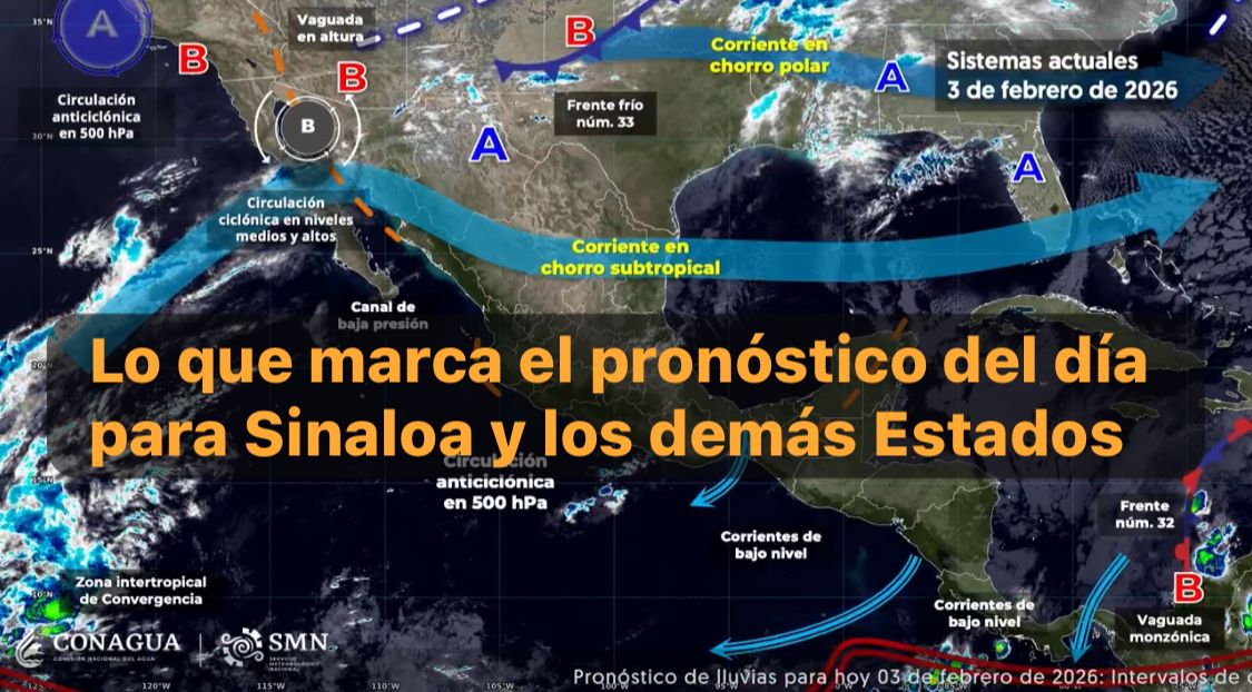 México,3 feb. 2026.-Hoy, el frente frío número 33 ingresará sobre el norte y noreste de México; interaccionará con una vaguada en altura y con la corriente en chorro subtropical, ocasionará vientos de 20 a 30 km/h con rachas de 40 a 60 km/h en Sinaloa, Chihuahua, Durango, Coahuila y Nuevo León.