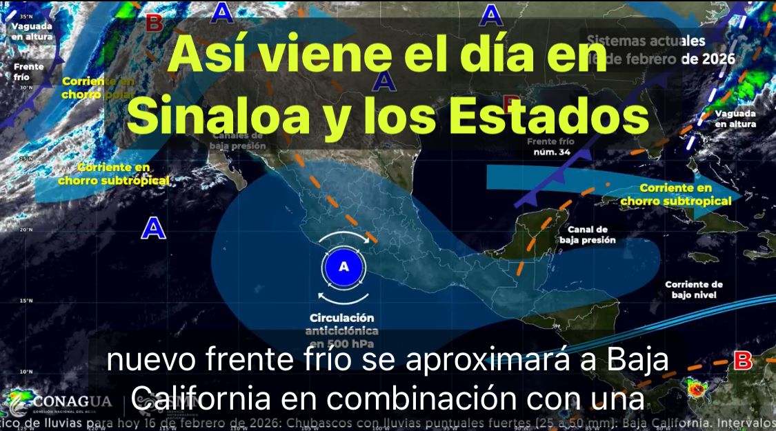 México, 16 Feb.2026.-Este día, un nuevo frente frío se aproximará a Baja California, en combinación con una vaguada polar y con la corriente en chorro subtropical, propiciarán lluvias puntuales fuertes en Baja California, chubascos en Sonora y lluvias aisladas en Baja California Sur, así como viento con rachas de 60 a 80 km/h en Baja California y Sonora; además de la posible caída de nieve o aguanieve en sierras de Baja California.
