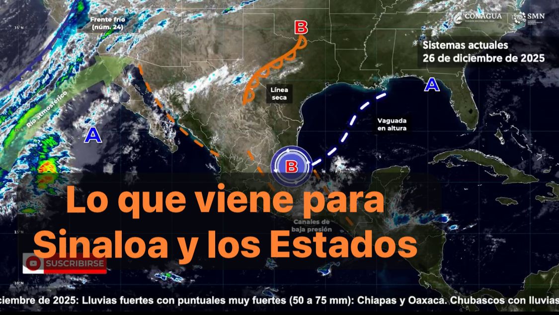México, 26 de dic. 2025.-Este día, un nuevo frente frío número 24 ingresará a Baja California, en combinación con una vaguada en niveles medios y altos de la atmósfera, la corriente en chorro polar y un río atmosférico, generarán descenso de temperatura en el noroeste del territorio nacional, así como lluvias puntuales fuertes en Baja California; adicionalmente lluvias y chubascos en Baja California Sur, Sonora y Chihuahua.