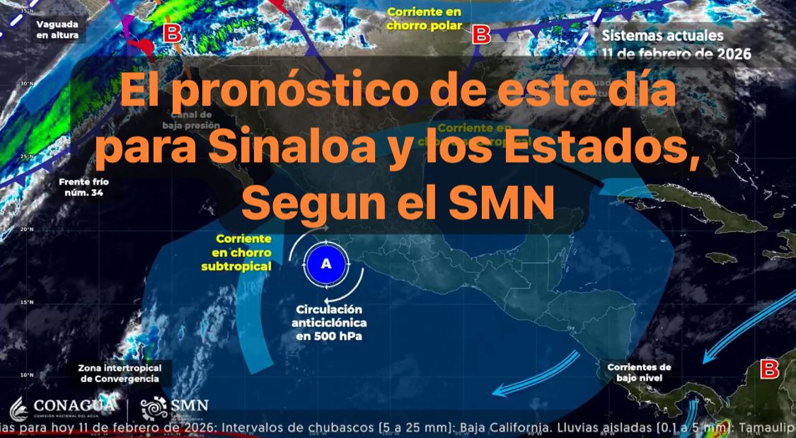 México,11 feb.2026.Para hoy, el anticiclón en niveles medios de la atmósfer-a mantendrá tiempo estable, baja probabilidad de lluvia y ambiente cálido a caluroso sobre la mayor parte del territorio nacional.