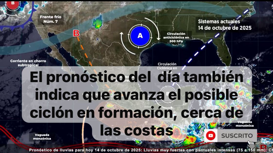 México,14 oct.2025.-Este día, canales de baja presión sobre el occidente del golfo de México, el sureste mexicano y la península de Yucatán, en interacción con una circulación ciclónica en niveles altos que desplazará sobre el sur de dicho golfo y con una zona de baja presión con probabilidad para desarrollo ciclónico en el Pacífico Sur Mexicano, originarán lluvias puntuales intensas en Chiapas; puntuales muy fuertes en Tabasco, Veracruz y Oaxaca; y puntuales fuertes en Quintana Roo, Yucatán y Campeche.