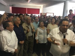 Para cuando el aspirante a la Alcaldía arribó, el lleno era total y entre gritos de apoyo, porras, aplausos, saludos y abrazos, se abrió paso hasta llegar al auditorio en el que se encontraban los representantes del Órgano Auxiliar de la Comisión Estatal de Procesos Internos.
