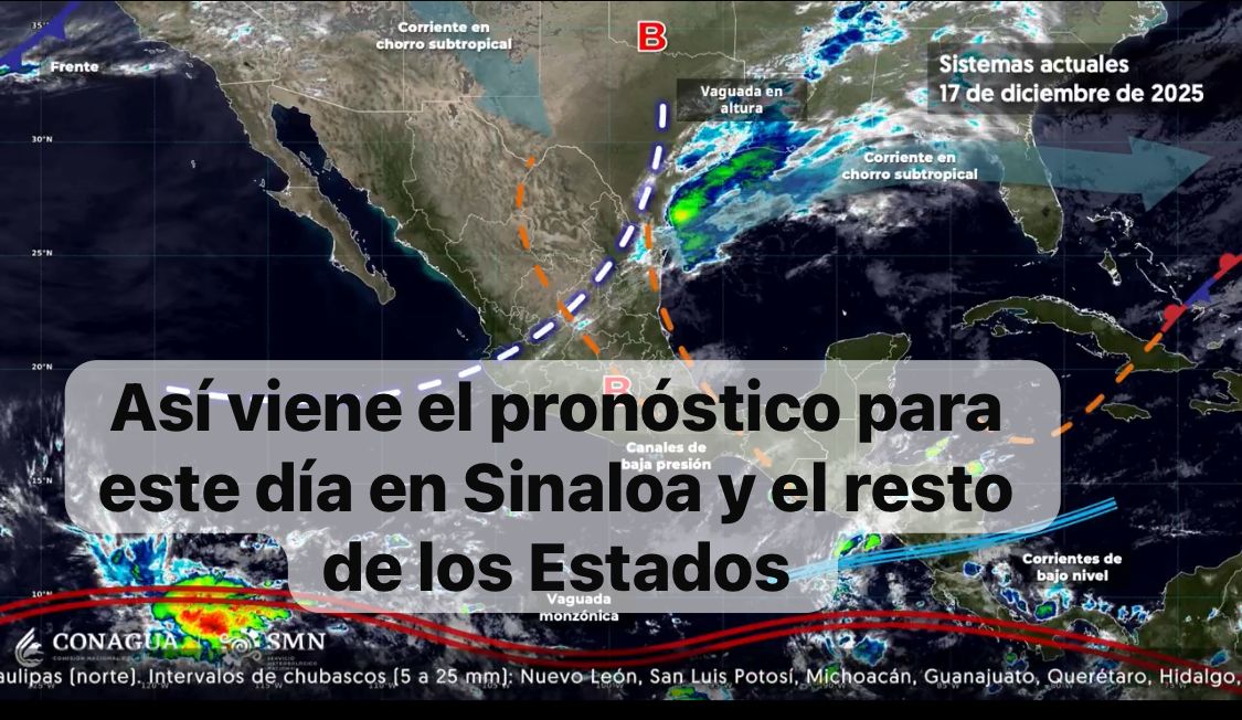 México 17 dic. 2025.-Para hoy, canales de baja presión sobre el oriente y sureste del territorio mexicano, en interacción con una vaguada en altura sobre el noreste, centro y occidente del país, con la corriente en chorro subtropical y con el ingreso de aire húmedo del océano Pacífico y golfo de México, generarán lluvias puntuales fuertes en Tamaulipas (norte); chubascos en estados del norte, noreste, occidente, centro y sureste del territorio nacional, además de la península de Yucatán.