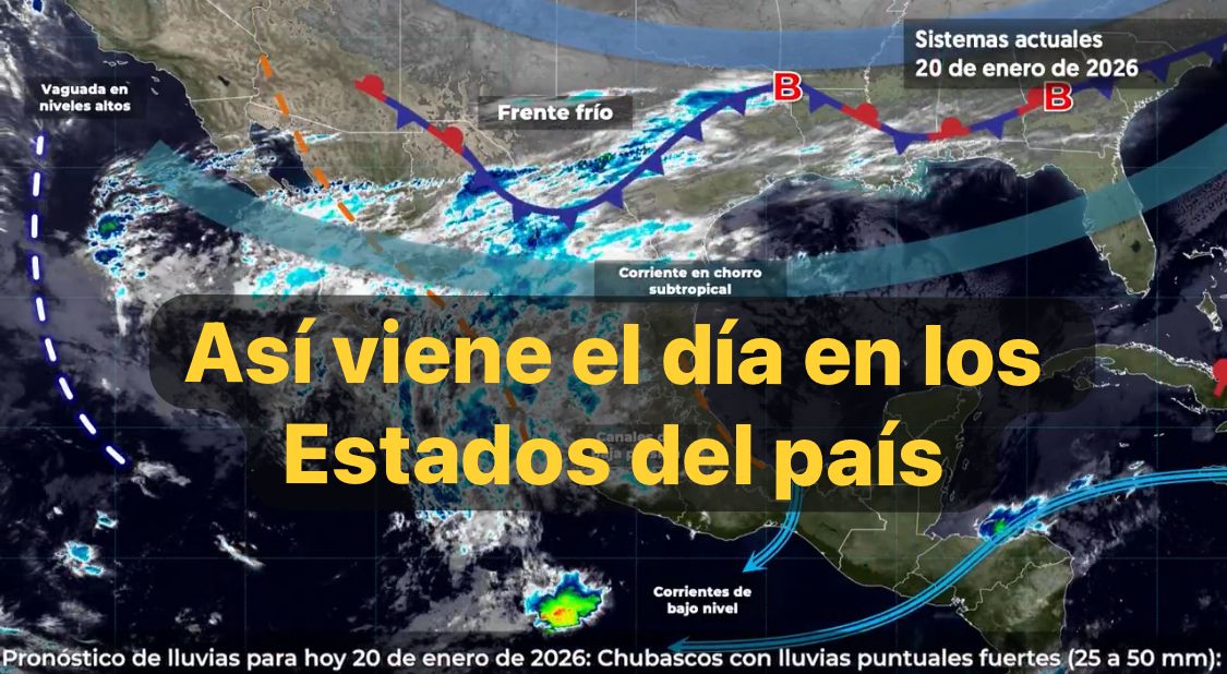 México, 20 ene. 2026.-Para hoy, una vaguada en niveles altos de la atmósfera en el noroeste y occidente de la República Mexicana, en combinación con la corriente en chorro subtropical, ocasionarán lluvias puntuales fuertes en Sinaloa, Chihuahua, Coahuila, Durango, Zacatecas y Nayarit; así como intervalos de chubascos en Jalisco y Aguascalientes; y lluvias aisladas en zonas de Baja California Sur, Sonora y Colima.