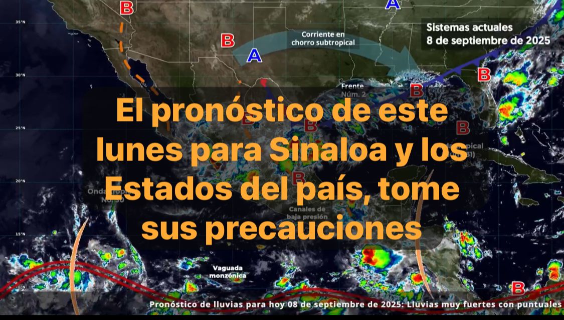 México, 8 sept. 2025.-Para hoy, el monzón mexicano originará lluvias puntuales intensas en Nayarit; puntuales muy fuertes en Sinaloa y Durango; lluvias con intervalos de chubascos en Sonora y Chihuahua; así como lluvias aisladas en zonas de Baja California Sur y Baja California.