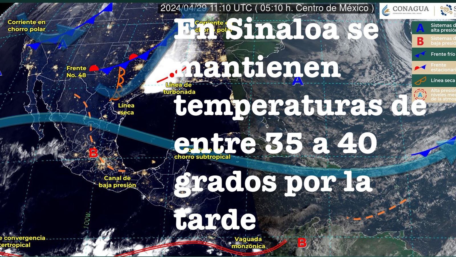 México,29 de Abril del 2024.-Este lunes, una línea seca sobre el norte del país, interaccionará con un canal de baja presión en el noreste del territorio nacional y con la corriente en chorro subtropical, producirán lluvias y chubascos, descargas eléctricas, posible caída de granizo y fuertes rachas de viento con probabilidad de tolvaneras en las regiones mencionadas, así como lluvias puntuales fuertes en Tamaulipas.