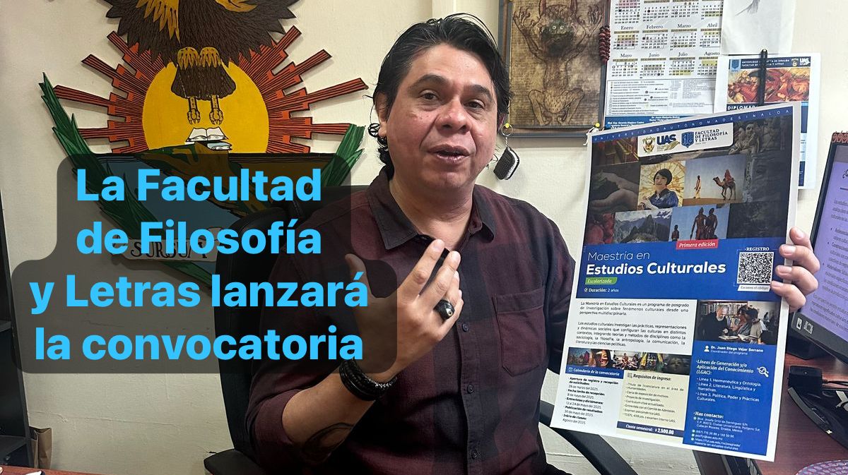 Culiacán,Sin.,5 feb. 2025.-En cumplimiento de los estándares de calidad educativa que ofrece la Universidad Autónoma de Sinaloa (UAS), la Facultad de Filosofía y Letras lanza la convocatoria de la Maestría en Estudios Culturales, en la modalidad escolarizada, anunció Orlando Espinoza Díaz, director de esta unidad académica.