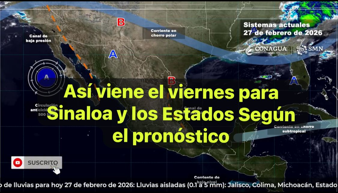 México, 27 feb. 2026.-Hoy viernes, una circulación anticiclónica y la entrada de humedad del océano Pacífico y golfo de México propiciarán tiempo estable y ambiente caluroso a muy caluroso en la mayor parte del país, persistiendo la onda de calor en Baja California Sur (centro), Durango (oeste), Jalisco (centro-sur), Guerrero (centro) y Oaxaca (centro y oriente), además de Michoacán (centro y suroeste), Morelos y Puebla (suroeste).