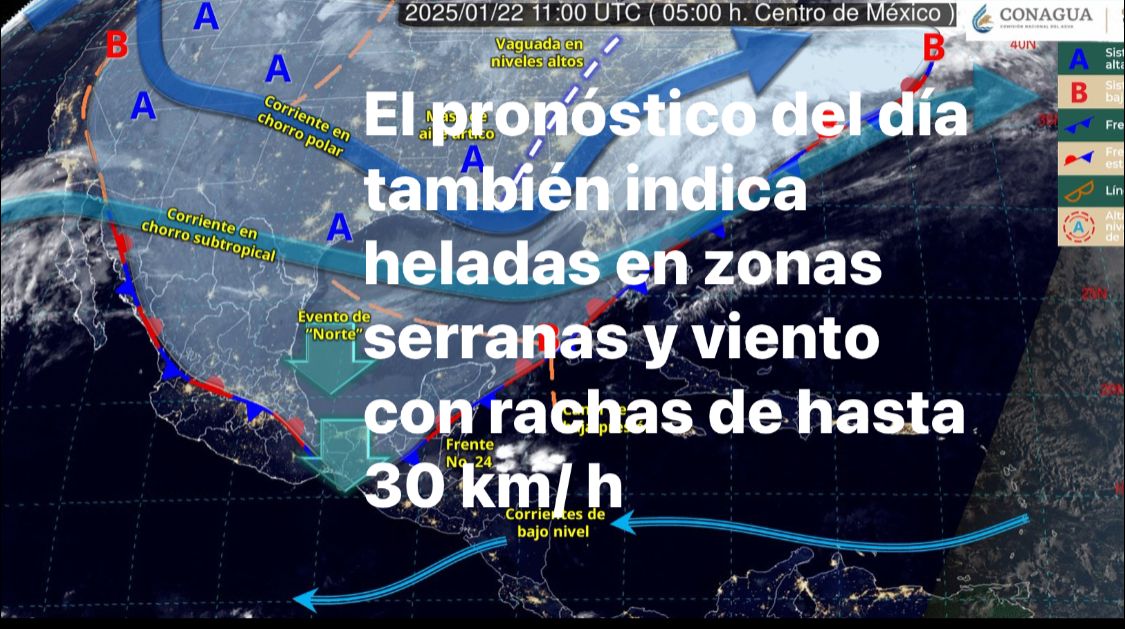 Mesa Central: Cielo medio nublado durante el día, con lluvias aisladas en Puebla. Sin lluvia en el resto de la región. Durante la mañana, ambiente muy frío a gélido con posibles heladas. Por la tarde ambiente fresco. Viento de dirección variable de 20 a 30 km/h y rachas de 40 a 60 km/h en Guanajuato, y rachas de hasta 40 km/h en el resto de la región.