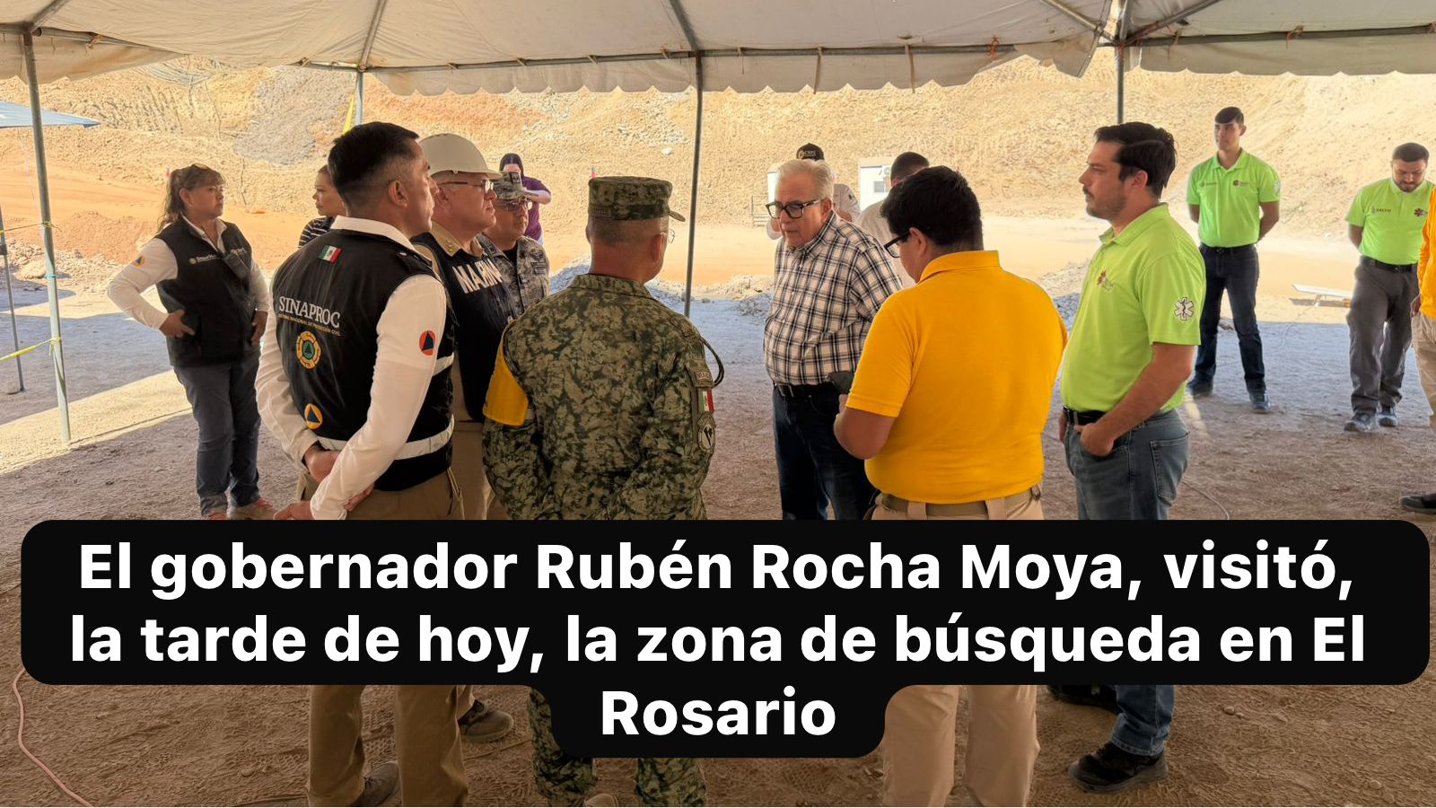 Rosario, Sin., 9 abril 2026.- Pendiente del operativo para rescatar al minero que aún permanece en la mina Santa Fe, el gobernador Rubén Rocha Moya, visitó, la tarde de hoy, la zona de búsqueda en el municipio serrano, donde se reunió con personal que encabeza las tareas de rescate.