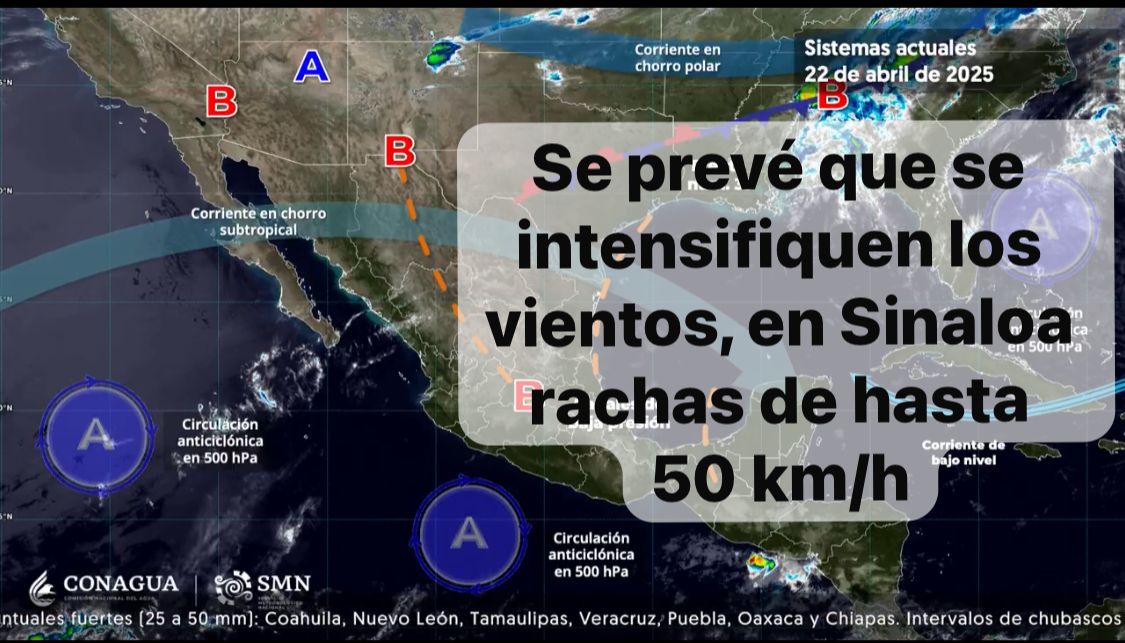 México, 22 abril 2025.-Para este día, canales de baja presión extendidos sobre la Mesa del Norte, el centro y sureste del país, en combinación con una línea seca sobre el norte del territorio nacional y con el ingreso de humedad del océano Pacífico, golfo de México y mar Caribe.