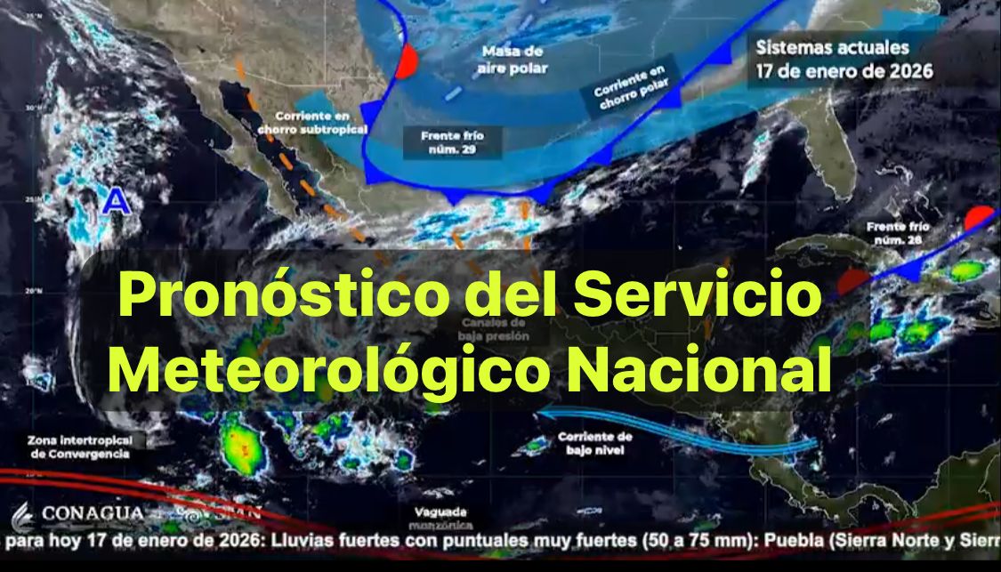 México, 17 ene. 2026.-Este día, el frente frío número 29 se desplazará sobre el noreste y oriente del territorio nacional, en interacción con una vaguada en altura y las corrientes en chorro polar y subtropical, originarán lluvias y chubascos en dichas regiones, así como lluvias de fuertes a muy fuertes en Querétaro, Hidalgo, Puebla y Veracruz.