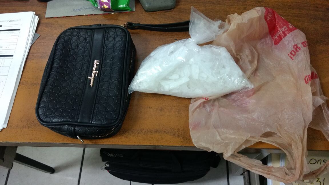 En un bolso negro (tipo piel) que llevaba bajo la axila, los policías encuentran una bolsa de plástico transparente en cuyo interior había una sustancia granulada y cristalina en piedra de la droga conocida como cristal que más tarde al verificarse, arrojó un peso de 455 gramos.