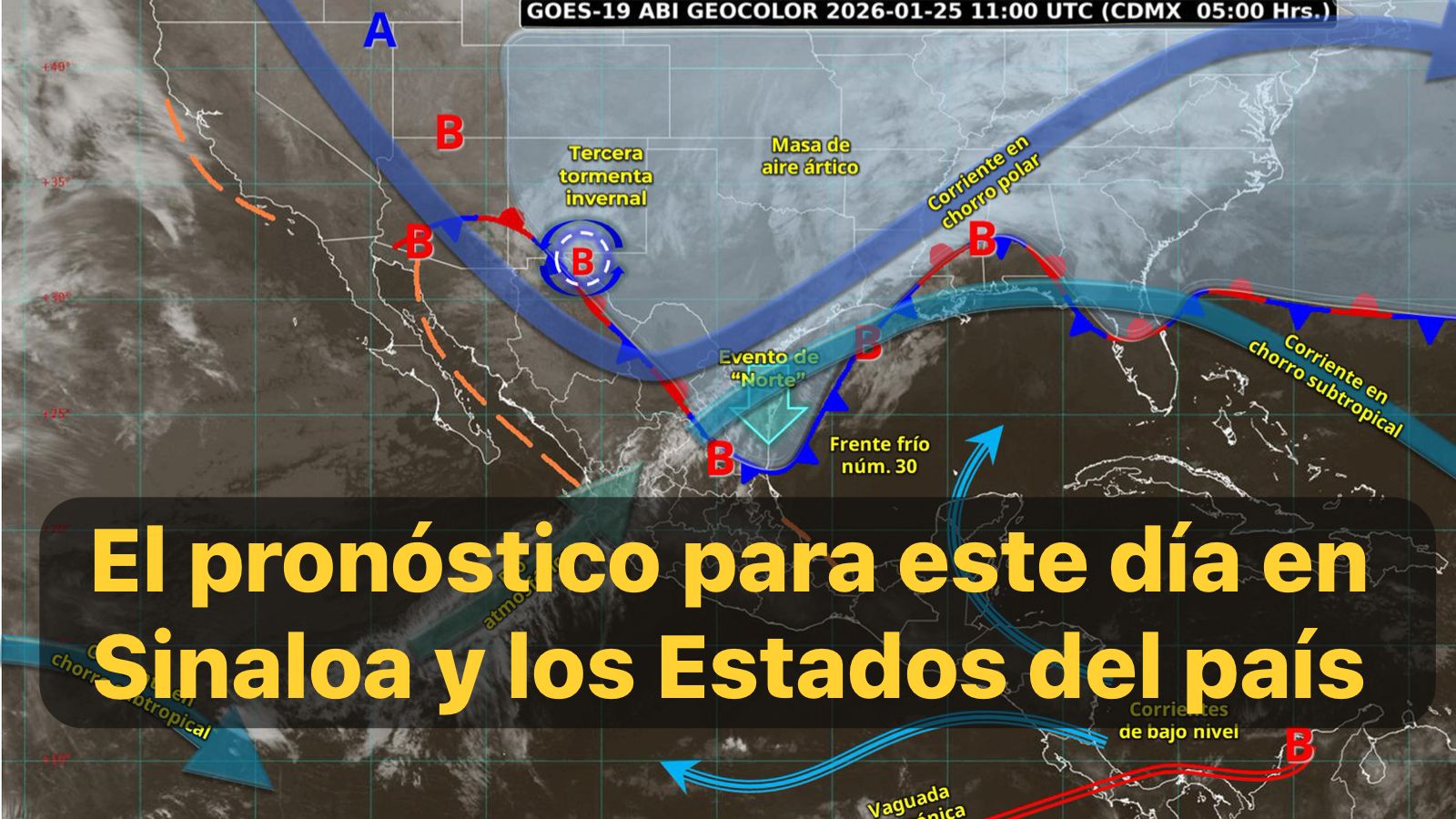 México,25 ene. 2026.-Este día, la tercera tormenta invernal de la temporada se desplazará sobre el norte del territorio mexicano, continuará interaccionando con un río atmosférico ocasionando lluvias y chubascos en dicha región, así como caída de nieve o aguanieve, durante la mañana, en zonas de Sonora y Chihuahua; además de lluvia engelante en zonas de Durango, Coahuila, Nuevo León y San Luis Potosí.