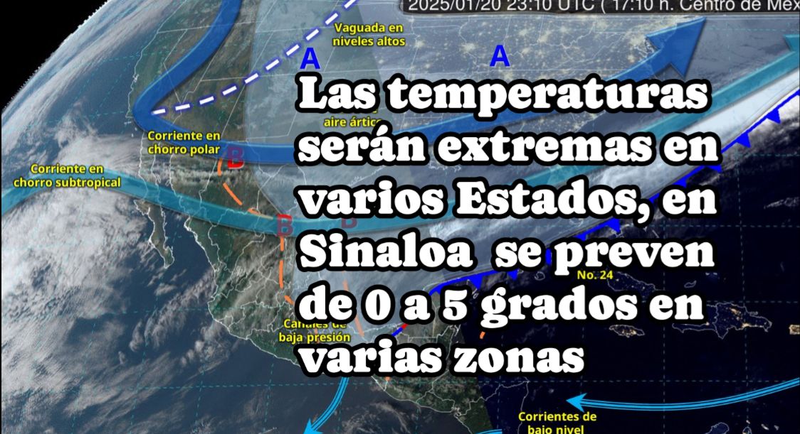 Para mañana, se prevé el reforzamiento de la masa de aire ártico asociada al frente No. 24, la cual interaccionará con una vaguada en niveles altos de la atmósfera que se desplazará sobre el norte y noreste de México y con las corrientes en chorro polar y subtropical, por lo que se mantendrá la onda fría sobre estados del norte y noreste del territorio nacional, continuando el ambiente frío a muy frío durante la mañana y noche en zonas del noroeste, oriente, centro y sureste del país, presentándose ambiente gélido en sierras de Baja California, Sonora, Chihuahua, Durango, Coahuila, Nuevo León, Tamaulipas y Zacatecas; asimismo, se prevé un nuevo evento de “Norte” muy fuerte a intenso con rachas de viento de 100 a 120 km/h en Tamaulipas y Veracruz, con rachas de 90 a 110 km/h en el istmo y golfo de Tehuantepec; y con rachas de 60 a 80 km/h en Tabasco, Campeche, Yucatán y el norte de Quintana Roo; así como oleaje de 5 a 7 metros de altura en las costas de Tamaulipas y Veracruz, de 3 a 5 metros de altura en el golfo de Tehuantepec y las costas de Tabasco, Campeche, Yucatán y Quintana Roo (norte). Además, existirán condiciones para la caída de nieve, aguanieve o lluvia engelante en zonas de Coahuila, Nuevo León y Tamaulipas, así como lluvia engelante en San Luis Potosí (oriente), Guanajuato (noreste), Querétaro (norte y noreste), Hidalgo (norte), Puebla (norte) y Veracruz (noroeste).