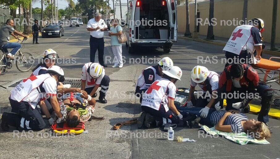 Un hombre y un mujer terminaron en el pavimento con algunas lesiones en su cuerpo tras impactarse contra una camioneta que no realizo el alto correspondiente en uno de los cruces de la avenida Cruz Lizarraga.