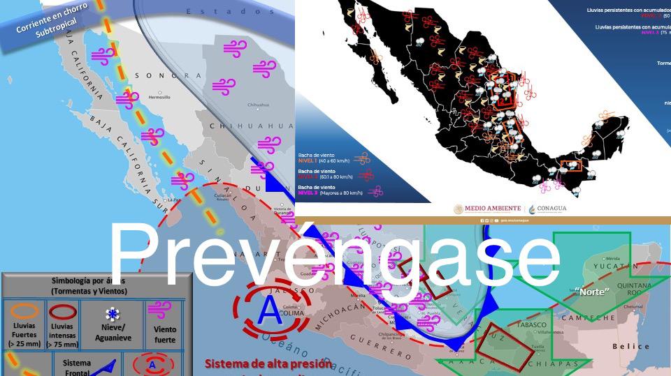 Además, fuertes rachas de viento con posibles tolvaneras continuarán en los estados del norte y centro del país, con velocidades de 60 a 70 km/h en zonas de Aguascalientes, Chihuahua, Ciudad de México, Coahuila, Durango, Estado de México, Guanajuato, Guerrero, Hidalgo, Michoacán, Morelos, Nuevo León, Puebla, Querétaro, San Luis Potosí, Tlaxcala y Zacatecas; y de 50 a 60 km/h en Baja California, Baja California Sur, Jalisco, Nayarit, Sinaloa, Sonora y el Golfo de California.