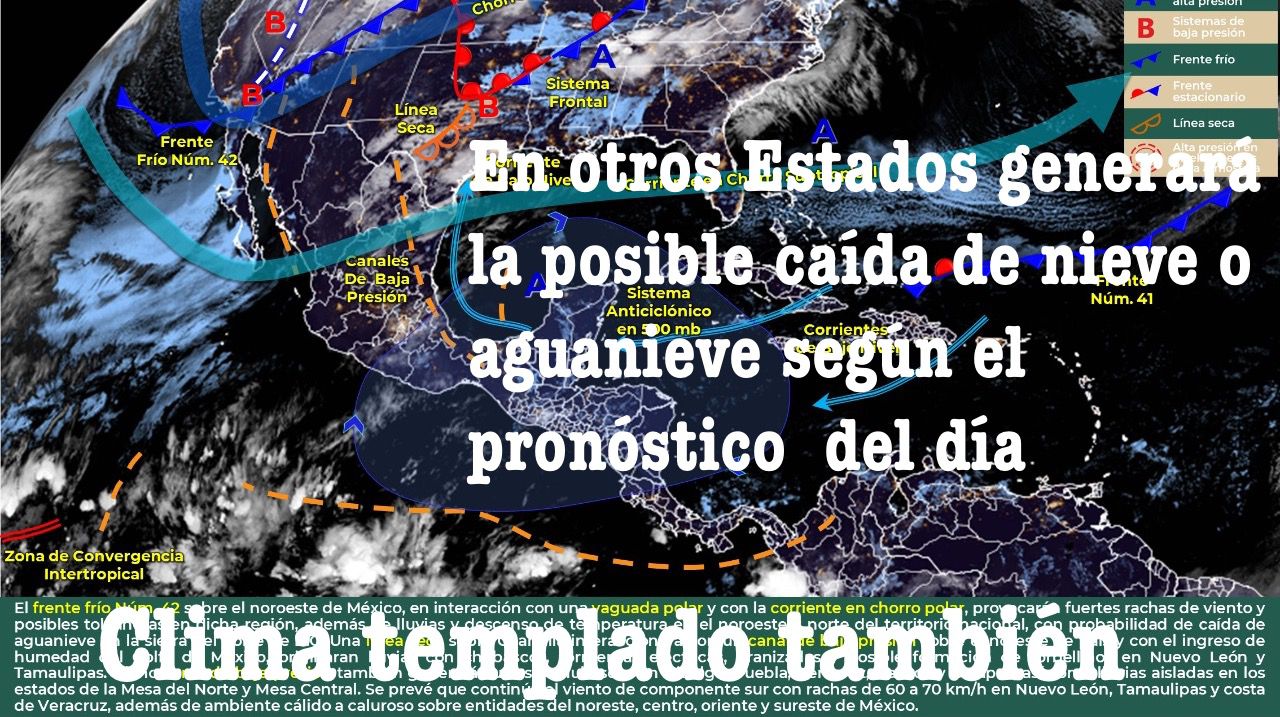Ciudad de México, a 12 de abril del 2022.- Para hoy, el frente frío Número 42 localizado sobre el noroeste de México, en interacción con una vaguada polar y con la corriente en chorro polar, provocarán fuertes rachas de viento y posibles tolvaneras en dicha región, además de lluvias y descenso de temperatura en el noroeste y norte del territorio nacional, con probabilidad de caída de aguanieve en la sierra del norte de B.C.