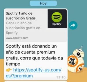 El mensaje de WhatsApp llega con un link y un texto que menciona que Spotify “está donando un año de cuenta premium gratis”.
