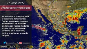 Asimismo, se prevén tormentas fuertes en sitios de Nuevo León, San Luis Potosí, Hidalgo, Nayarit, Jalisco, Colima, Ciudad de México, Tabasco, Quintana Roo y Campeche; intervalos de chubascos en áreas de Sonora, Sinaloa, Chihuahua, Coahuila, Aguascalientes, Zacatecas, Durango, Guanajuato, Querétaro y Yucatán, y lluvias dispersas en Baja California Sur.