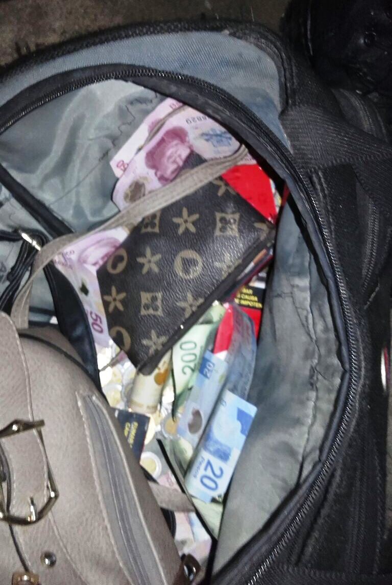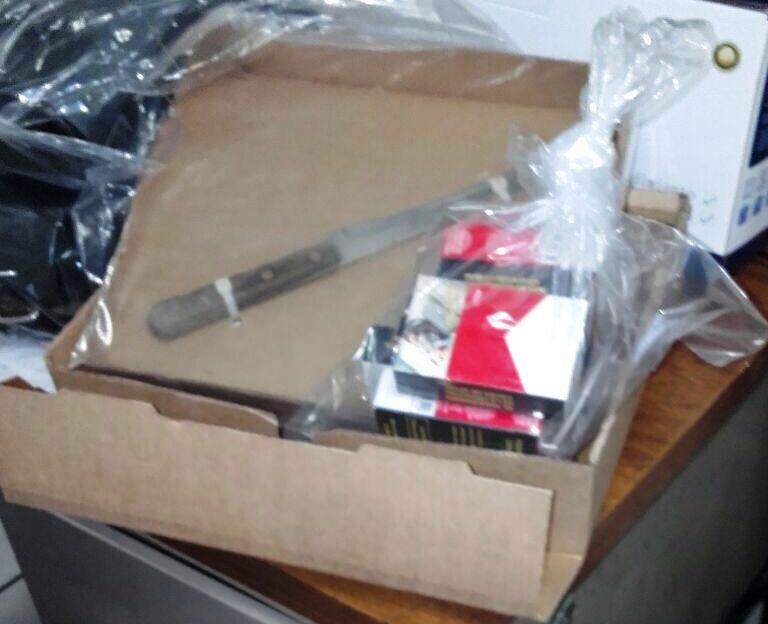 Al efectuarle una revisión, se le encontró fajado en la cintura, un cuchillo de cocina con cachas de madera así como el maletín color gris con negro que cargaba.