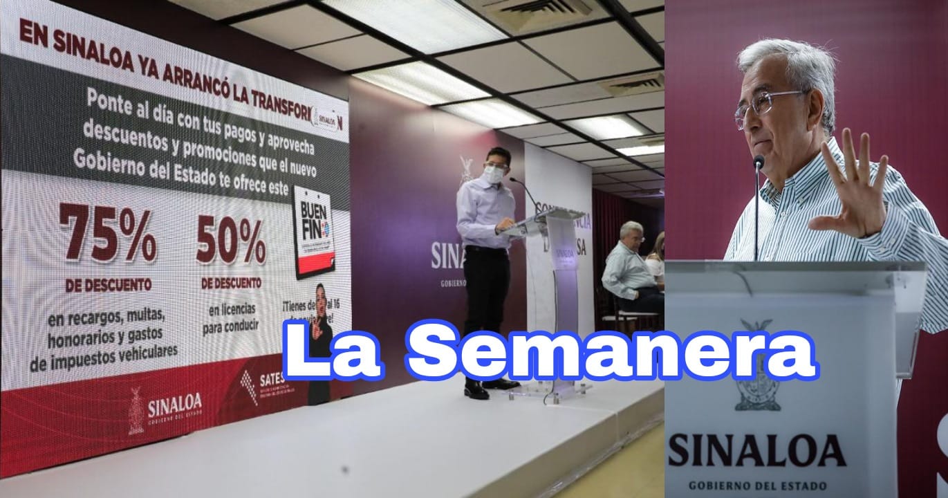 Culiacán, Sinaloa, a 8 de noviembre de 2021. – Para apoyar la economía de las familias sinaloenses, el gobernador Rubén Rocha Moya anunció que el Gobierno del Estado se sumará al Buen Fin, pues en esta semana se ofrecerán descuentos del 75 por ciento en multas, recargos, honorarios y gastos en los trámites vehiculares, para que los contribuyentes que mantienen algún rezago en estas obligaciones fiscales se pongan al corriente aprovechando los descuentos.