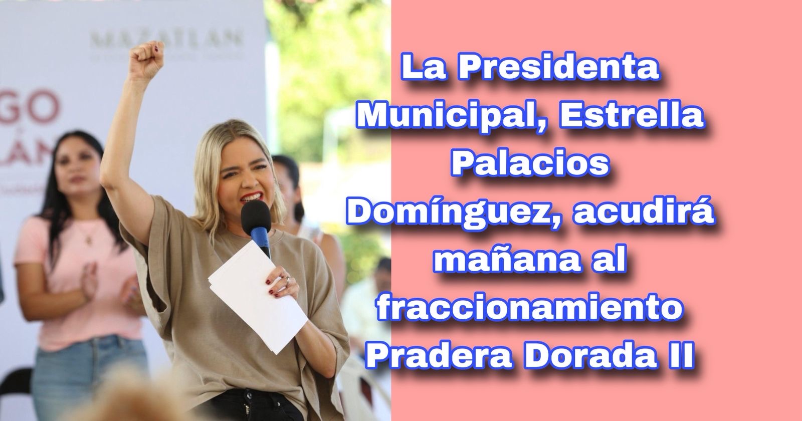 Mazatlán, Sin., 9 sept.2025.– Con el objetivo de ofrecer atención directa y cercana a las y los ciudadanos, la Presidenta Municipal, Estrella Palacios Domínguez, encabezará la jornada de atención ciudadana “Contigo Mazatlán, este miércoles 10 de septiembre, en el fraccionamiento Pradera Dorada II, específicamente en la Unidad Deportiva Genaro Estrada, a partir de las 16:00 horas.