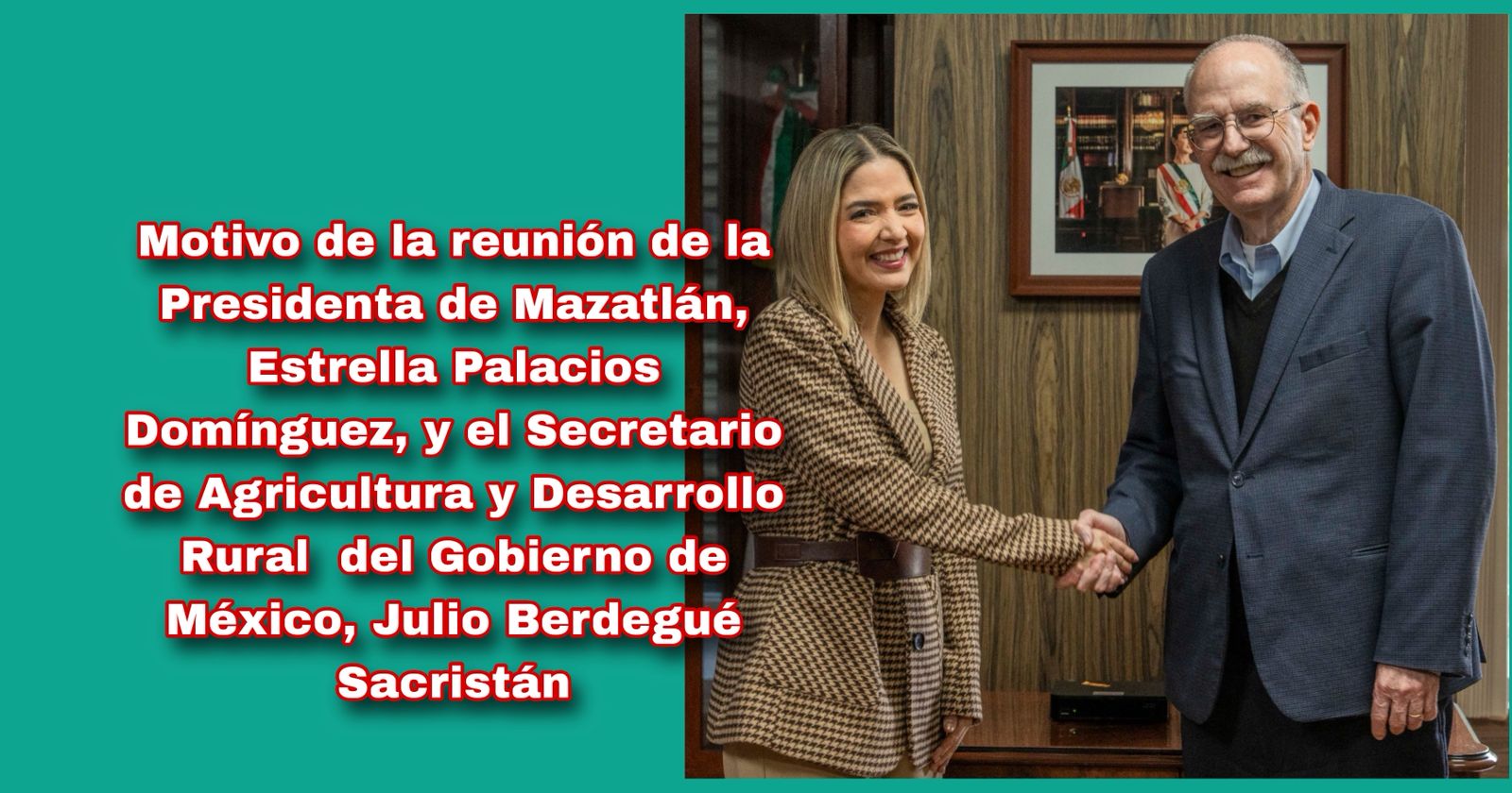 México, 27 ene.2026.– La Presidenta de Mazatlán, Estrella Palacios Domínguez, sostuvo una reunión de trabajo con el Secretario de Agricultura y Desarrollo Rural (SADER) del Gobierno de México, el Doctor Julio Berdegué Sacristán, con el objetivo de fortalecer la coordinación institucional y avanzar en proyectos estratégicos para el municipio.