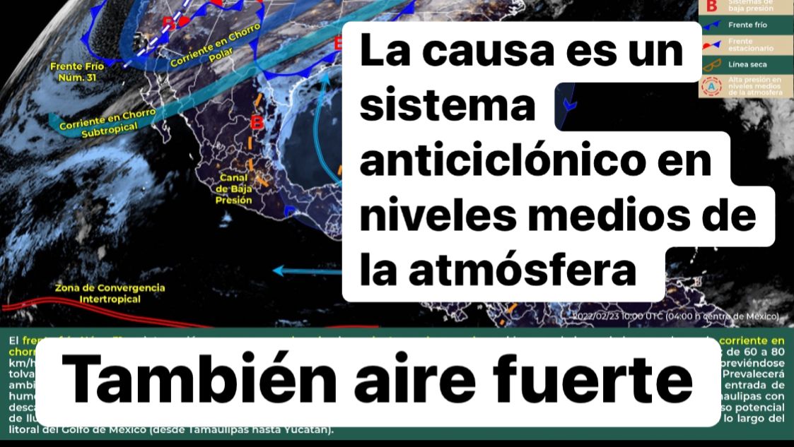 Finalmente, un sistema anticiclónico en niveles medios de la atmósfera, ocasionará ambiente vespertino cálido a caluroso en gran parte del territorio mexicano (excepto en el norte y noreste). A su vez, se prevé viento del este y sureste, con rachas de 50 a 60 km/h en Tabasco y la Península de Yucatán.