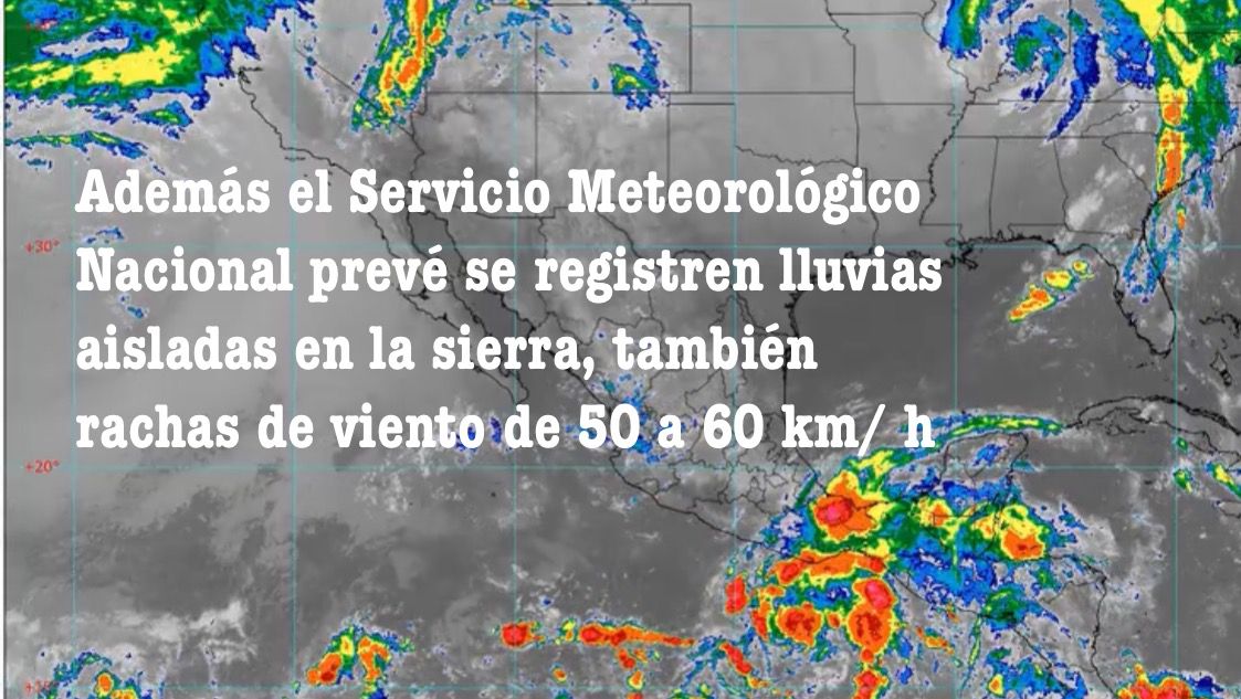 Pacífico Sur: Cielo nublado durante el día con lluvias puntuales intensas en Oaxaca y Chiapas, así como fuertes en Guerrero; todas con descargas eléctricas y posible caída de granizo, las cuales podrían generar deslaves e inundaciones. Ambiente matutino fresco a templado. Frío con bancos de niebla en sierras de Oaxaca y Chiapas. Ambiente caluroso por la tarde. Viento de componente este de 15 a 30 km/h en la región, con rachas de 60 a 70 km/h y oleaje de 1 a 3 metros de altura en costas de Oaxaca.