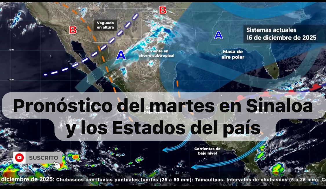 Pacífico Norte: Cielo con nubes dispersas; sin lluvia en Sonora y Sinaloa. Por la mañana, ambiente fresco en la región y muy frío a frío con heladas en zonas serranas de Sonora. Durante la tarde, ambiente templado en Sonora y caluroso en Sinaloa. Viento del oeste y noroeste de 10 a 20 km/h en la región, y rachas de 30 a 50 km/h en zonas de Sonora.