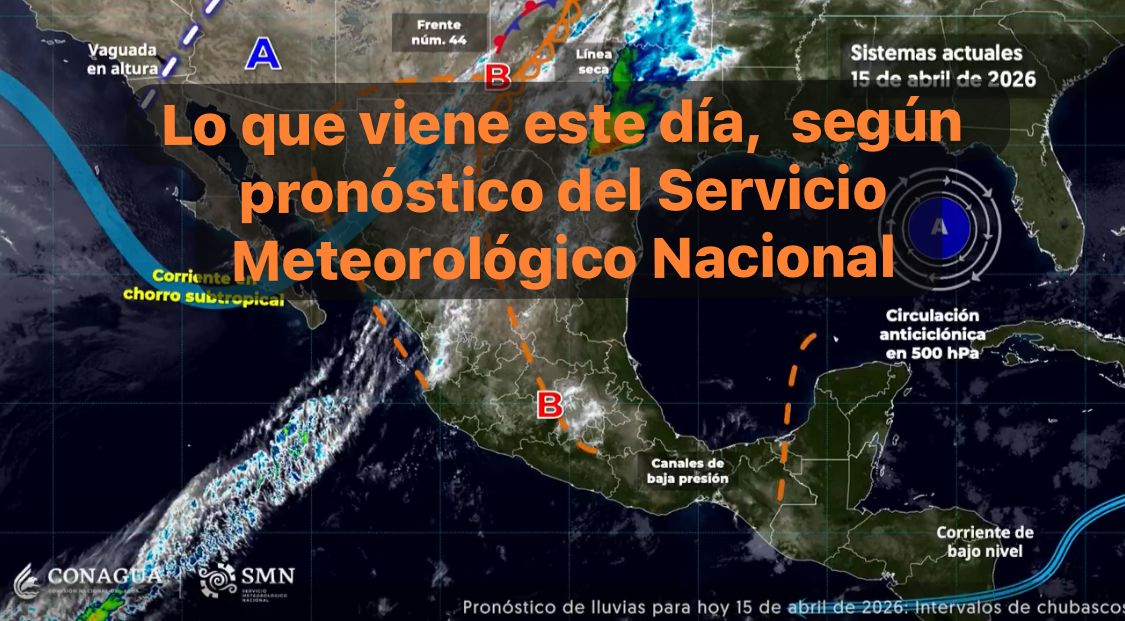 México,15 abril 2026.-Este día, una línea seca prevalecerá en el norte del territorio nacional, en interacción con el frente número 44, que se extenderá cerca de la frontera norte de México, con una vaguada en altura y con la corriente en chorro subtropical, ocasionarán intervalos de chubascos en Coahuila, Nuevo León, Tamaulipas y San Luis Potosí; además de lluvias aisladas en Chihuahua y Zacatecas; dichas lluvias podrían estar acompañadas con descargas eléctricas y caída de granizo.