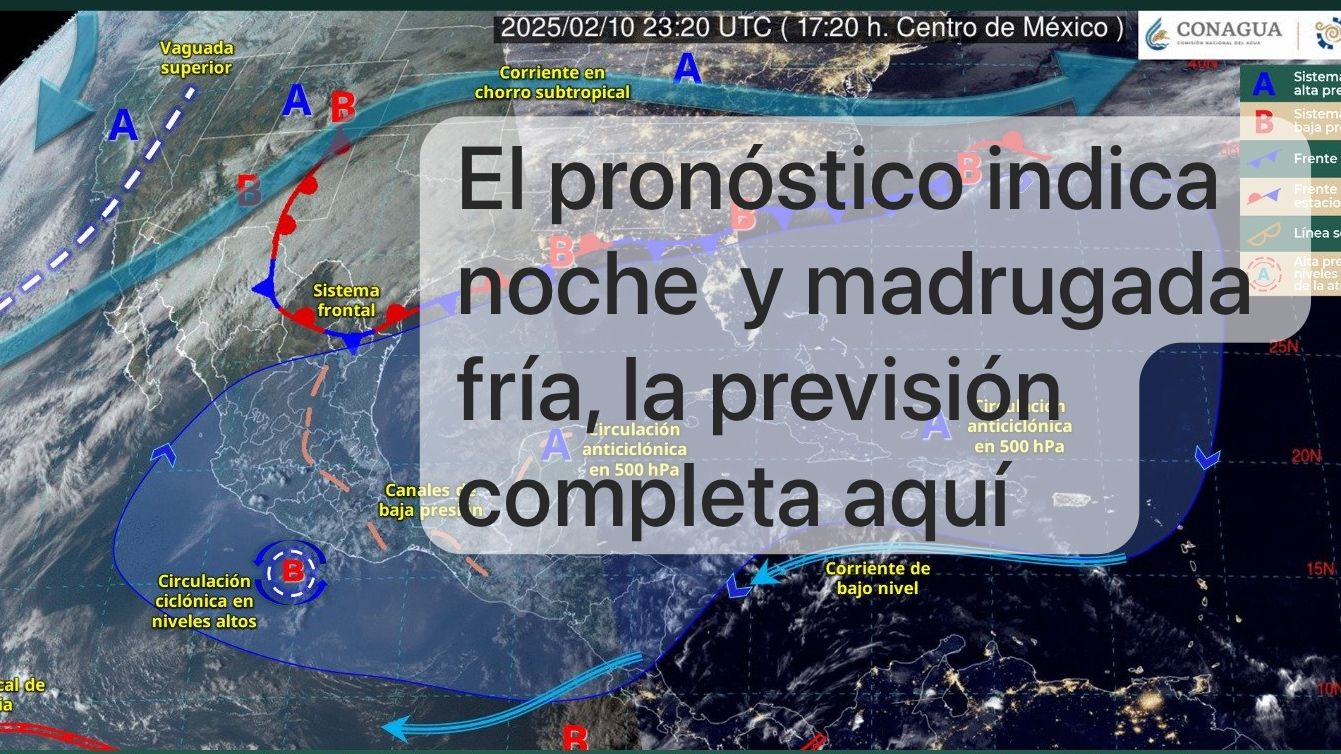 Valle de México: Por la mañana, cielo despejado a parcialmente nublado y ambiente frío a fresco en la región; con temperaturas de -5 a 0 °C en zonas altas del Estado de México. Durante la tarde, ambiente templado a cálido, condiciones de cielo parcialmente nublado a medio nublado, con probabilidad de lluvias aisladas en la Ciudad de México y el Estado de México. Viento del sureste de 15 a 25 km/h con rachas de hasta 50 km/h. La temperatura mínima pronosticada para la Ciudad de México es de 8 a 10 °C y la máxima de 25 a 27 °C. Para Toluca, Edo. Méx., se prevé una temperatura mínima de 3 a 5 °C y una máxima de 21 a 23 °C.