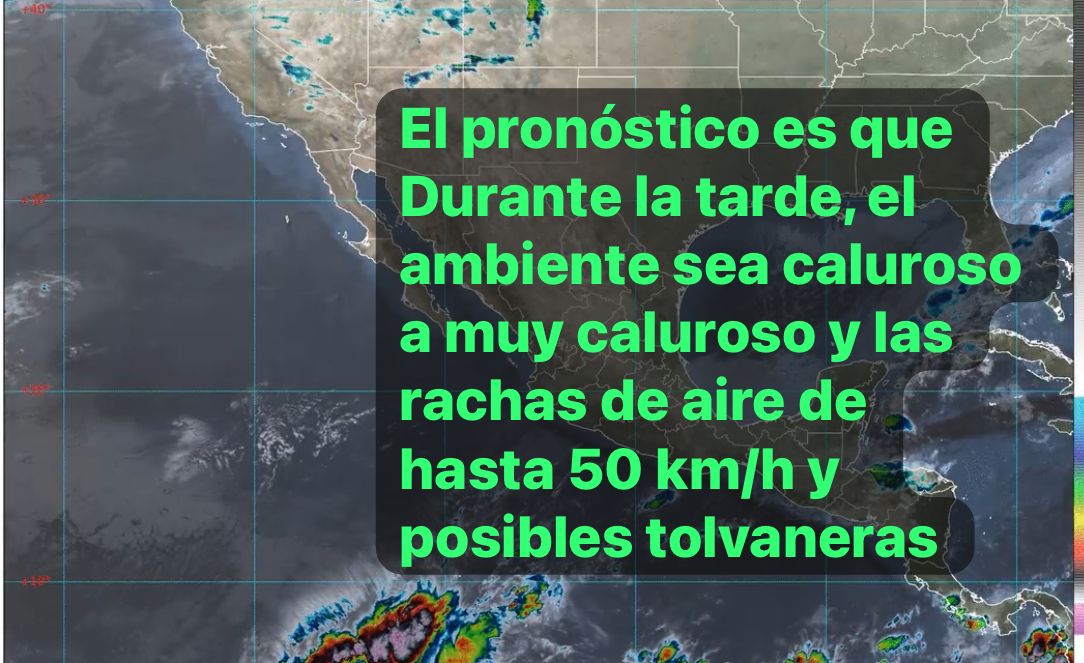 Mesa Central: Cielo medio nublado con lluvias aisladas en Puebla y Tlaxcala. Sin lluvia en el resto de la región. Por la mañana, bancos de niebla en zonas altas de la región, ambiente fresco a frío en Querétaro y Morelos, y de frío a muy frío con posibles heladas en zonas altas de Guanajuato, Hidalgo, Estado de México, Tlaxcala y Puebla. Durante la tarde, ambiente cálido en la región; caluroso en Morelos y Puebla (suroeste). Viento de dirección variable de 10 a 20 km/h con rachas de 30 a 50 km/h y posibles tolvaneras en Guanajuato, Querétaro, Hidalgo, Puebla y Tlaxcala; así como rachas de hasta 40 km/h en Morelos.